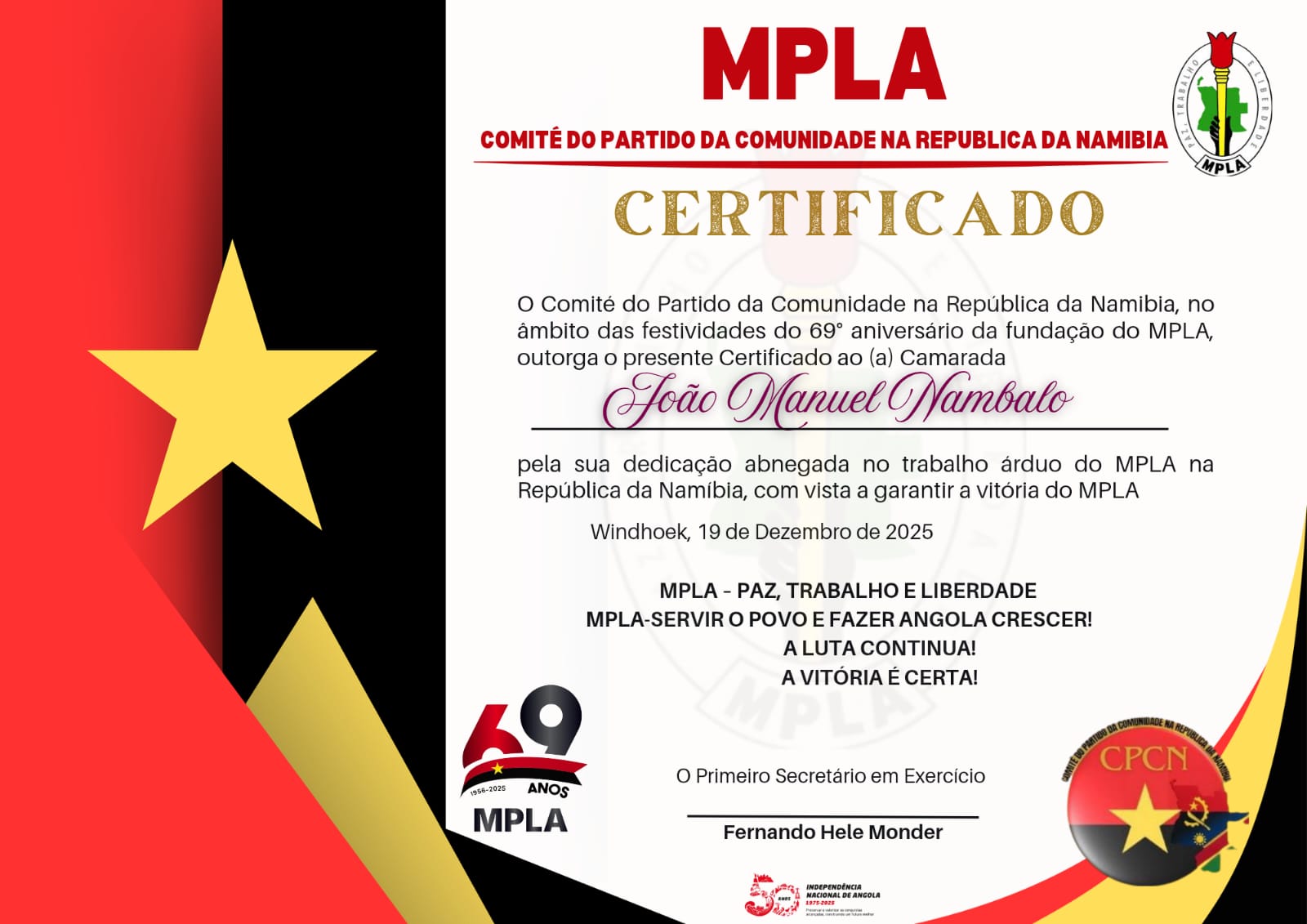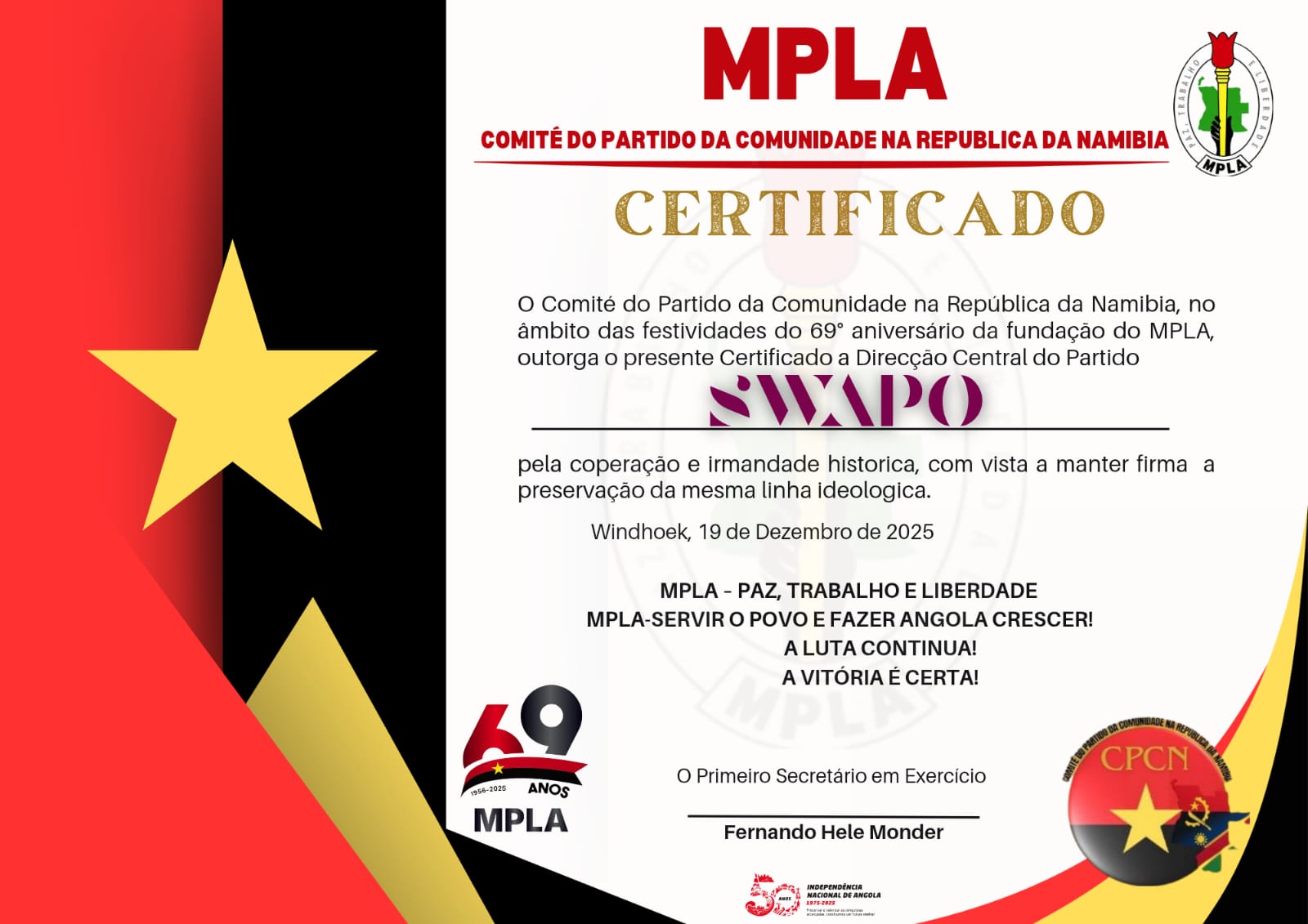 MPLA has played a central role in Angola's liberation and development. Today, the party continues to focus on good governance, social and economic development, and engagement with the Angolan diaspora worldwide — including the community in Namibia.